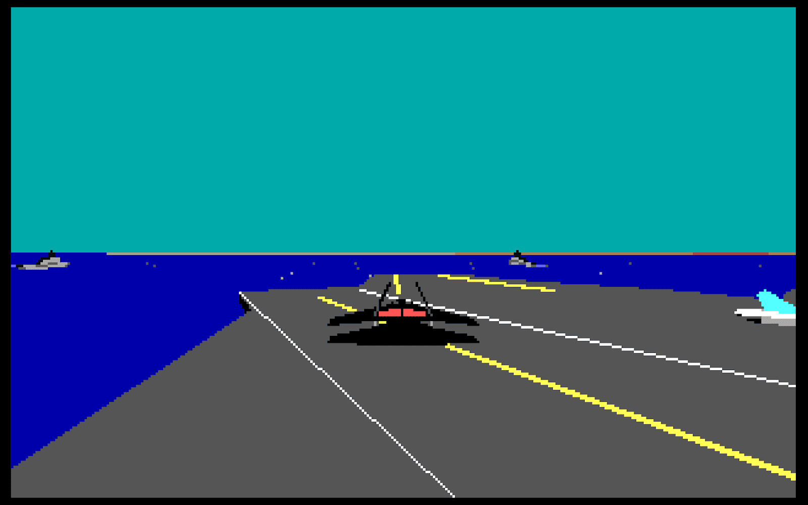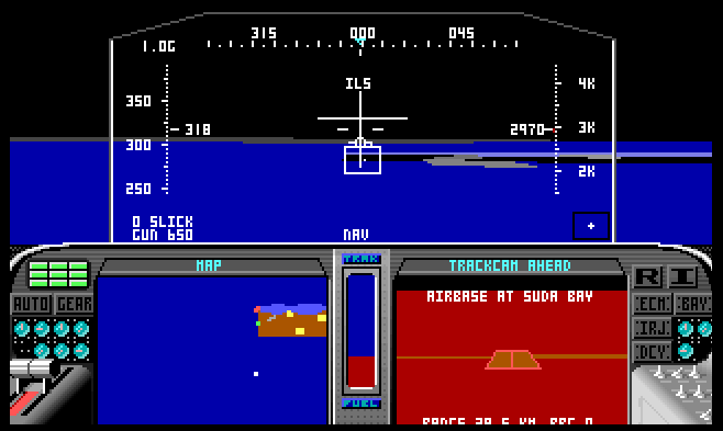 The DOS version of Stealth Fighter is an older generation PC game. My version came in 5'25" floppies and should work on a 8088/CGA PC. The roughly 320 x 100 pixel area reserved for the main view is surprisingly crude, and although there's a world of detail compared to the C64 game, the visuals are not that far from each other from today's perspective.