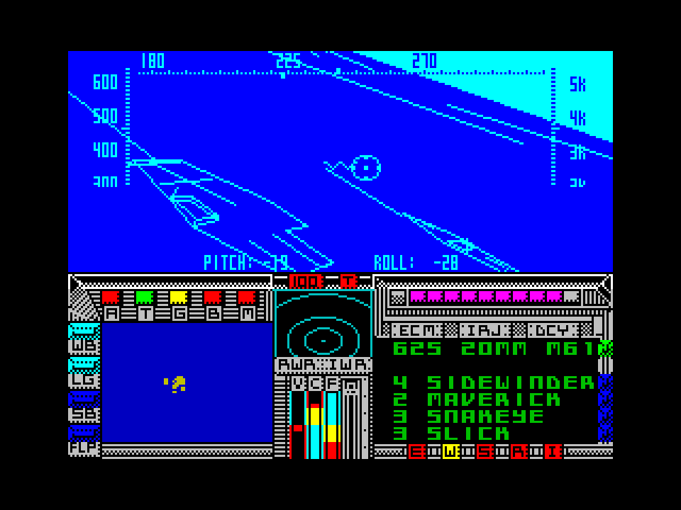 The most interesting feature in the game is the radar threat indicator which displays enemy radar signal strength against your craft "stealth" profile. Higher altitude generally means more visibility, and rolling the craft also increases your profile.